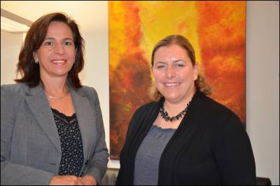 Barbara Richstein und Katherina Reiche, Parlamentarische Staatssekretärin beim Bundesminister für Umwelt, Naturschutz und Reaktorsicherheit, MdB, im Gespräch mit Schülern zum Thema Klimaschutz