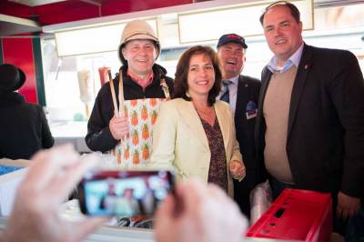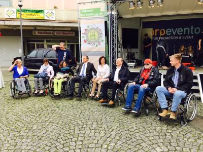 v.l.: Roger Lewandowski (Vizelandrat des Landkreises HVL), Rainer Bretschneider (Staatssekretär im Infrastrukturministerium), Barbara Richstein, Wilhelm Garn (Bürgermeister der Gemeinde Brieselang), Astrid Nozewnik (BBB-Fahrgast), Günter Lüder (BBB-Geschäftsführer)